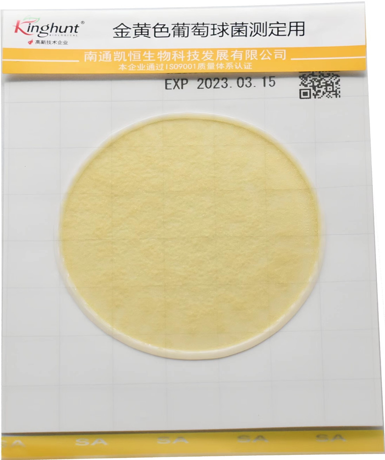 培養(yǎng)結(jié)束后取出測試片,藍(lán)色菌落為金黃色葡萄球菌,選擇菌落數(shù)為10cfu/片-150cfu/片的測試片進(jìn)行計(jì)數(shù)。廢棄物需經(jīng)121℃高壓滅菌20分鐘后處理。