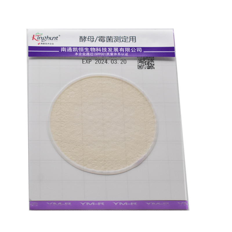 測試片以無紡布為基質(zhì),上面涂布有凝膠培養(yǎng)基。以防水透氣膜為上層膜,以無紡布為底板;測試片中添加有2種顯色底物,當酵母菌在測試片中生長繁殖,會形成不擴散的紫黑色菌落,或者中心為紫黑色外面有藍環(huán)的菌落;霉菌在測試片上形成淡紫色或者藍色菌落,通常呈擴散生長。