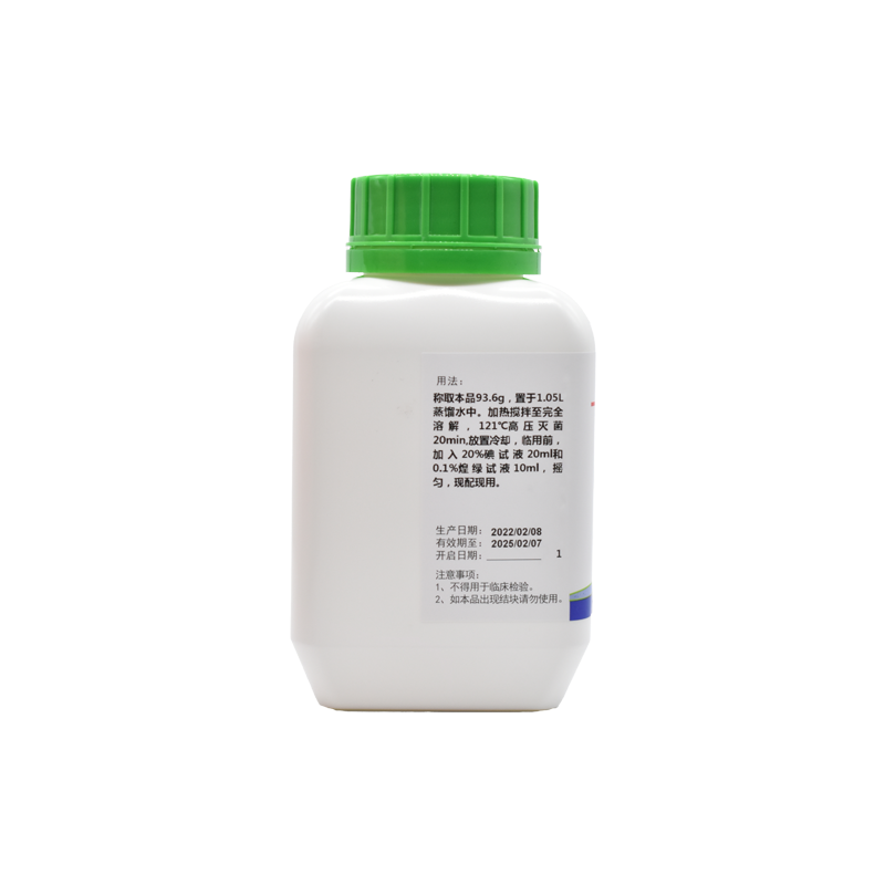 稱取本品93.6g,置于1.05L蒸餾水中。加熱攪拌至完全溶解,121℃高壓滅菌20min,放置冷卻,臨用前,加入20%碘試液20ml和0.1%煌綠試液10ml,搖勻,現(xiàn)配現(xiàn)用。