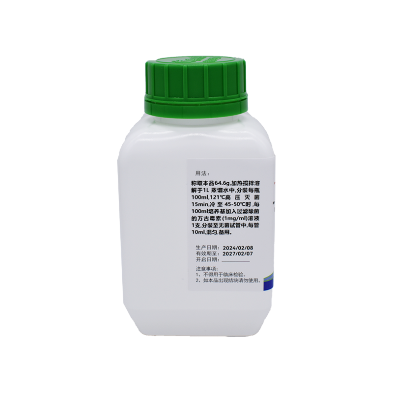 稱取本品64.6g,加熱攪拌溶解于1L蒸餾水中,分裝每瓶100ml,121℃高壓滅菌15min,冷至45-50℃時,每100ml培養(yǎng)基加入過濾除菌的萬古霉素(1mg/ml)溶液1支,分裝至無菌試管中,每管10ml,混勻,備用。