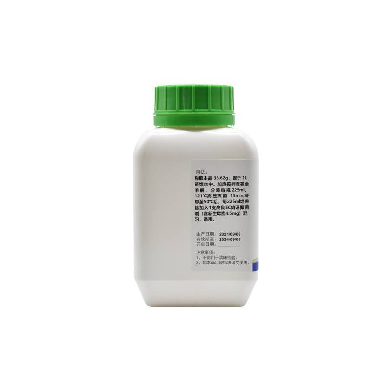 稱取本品 36.62g,置于 1L蒸餾水中。加熱攪拌至完全溶解,分裝每瓶225ml,121℃高壓滅菌15min,冷卻至50℃后,每225ml培養(yǎng)基加入1支改良EC肉湯抑菌劑(含新生霉素4.5mg)混勻,備用。